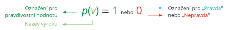 Výroky se označují obvykle malými písmeny (někdy i s dolními indexy), např. v_{1}, v_{2}, a, b apod. Pravdivostní hodnota pravdivého výroku se označuje číslem 1 , např. p(v)=1. Pravdivostní hodnota nepravdivého výroku v pak číslem 0 , např. p(v)=0.