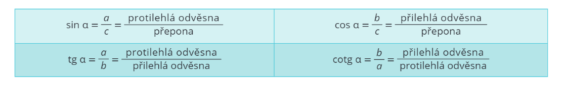 V tabulce níže se o každé z goniometrických funkcí dočteš, pomocí podílu kterých stran je definována. A také uvidíš, jak se zapisuje. Konkrétně je to ukázáno na úhlu a.