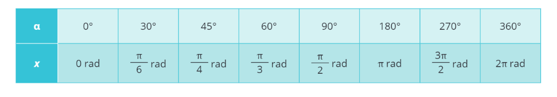 Z minulé podkapitoly si jistě pamatuješ hodnoty goniometrických funkcí některých úhlů ve stupních. Ale v matematice se také často používá hodnota \pi. Na zapamatování to není nic těžkého. Stačí si pamatovat, že úhel 360^{\circ} odpovídá 2 \pi, a díky tomu spočítáš velikost i ostatních úhlů. Potřebuješ k tomu umět pouze trojčlenku.