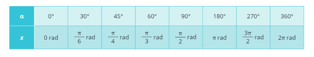 Základní hodnoty ve stupních a v radiánech: