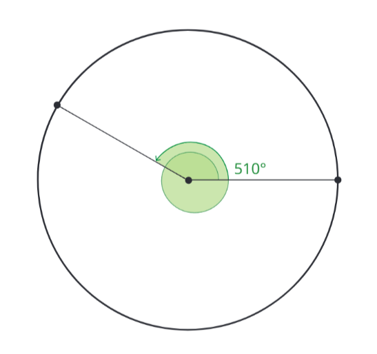 Například 510^{\circ} stupňů je kladné číslo, tudíž první z podmínek pro základní úhel splňuje. Je ale i nejmenší? To, zda je nejmenší, zjistíš tak, že zadaný úhel vydělíš 360^{\circ} (to je „jedna otáčka”) a zbytek dělení je hodnota základního úhlu. Pokud po vydělení vyjde pouze desetinné číslo (tj. menší než jedna a větší než nula), pak je úhel nejmenší.