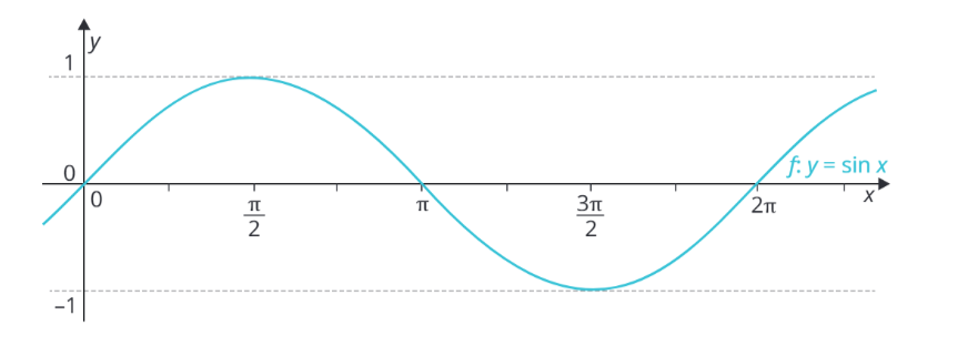 Grafem funkce sinus je křivka, která se nazývá sinusoida. Tato křivka vypadá jako vlnovka, která se neustále periodicky (pravidelně do nekonečna) opakuje. Její perioda je 2 \pi.