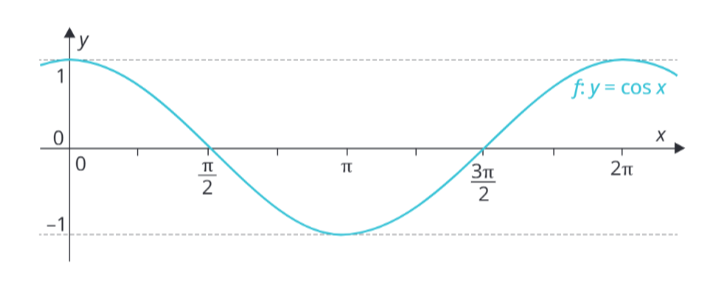 Grafem funkce kosinus je křivka, která se nazývá kosinusoida. Jedná se o periodickou funkci. To znamená, že se její graf pravidelně opakuje po určitých úsecích. Funkce kosinus má periodu 2 \pi.