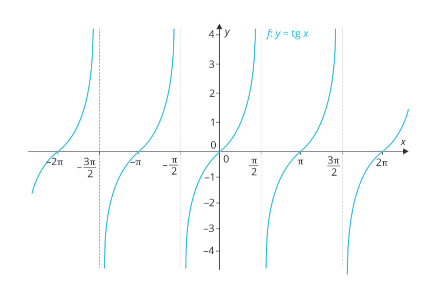 Grafem funkce tangens je křivka, která se jmenuje tangentoida. Jedná se o periodickou funkci, to znamená, že se její graf pravidelně opakuje po určitých úsecích. Periodou funkce tangens je hodnota \pi. Obsahuje asymptotu, ke které se funkce blíží, ale nikdy je neprotne. Obecně se označují čárkovanou čarou.