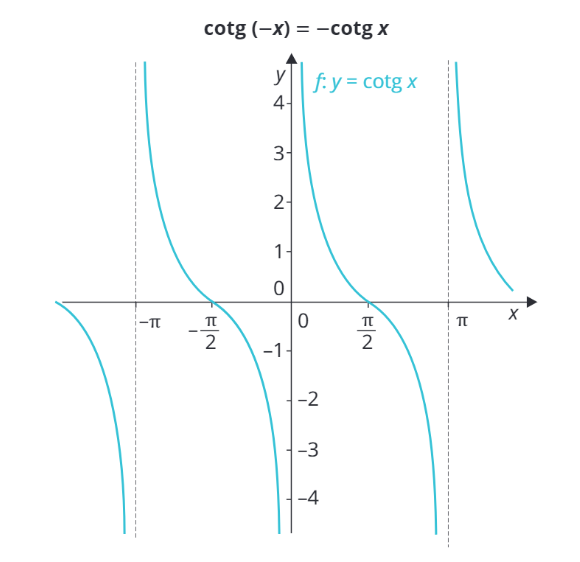 Grafem funkce kotangens je vlnitá křivka ze shora dolů a zároveň zleva doprava, to znamená, že její hodnoty stále klesají. Funkce kotangens je lichá a platí: