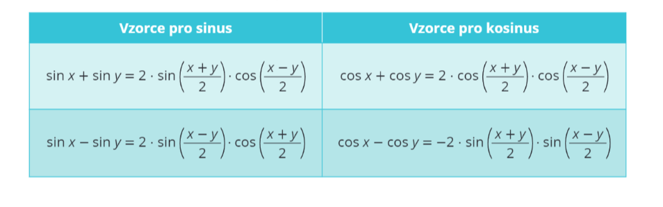 Ted' máš před sebou posledních pár goniometrických vzorců, které ti usnadní život při počítání goniometrických rovnic a obecně při úpravách složitých výrazů obsahujících alespoň jednu goniometrickou funkci. Stejně jako v předchozích vzorcích i zde Ize za neznámou x a y dosazovat libovolná reálná čísla.