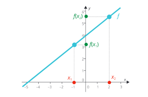 Když si vezmeš dvě libovolné hodnoty x_1,x_2 z definičního oboru, které se sobě nerovnají, pak po dosazení do zadání funkce se nerovnají ani jejich funkční hodnoty f\left(x_{1}\right) \neq f\left(x_{2}\right), což říká definice: pro všechny x_{1}, x_{2} \in D ; x_{1} \neq x_{2} \Rightarrow f\left(x_{1}\right) \neq f\left(x_{2}\right). Z obrázku to poznám tak, že pokud bych kdekoli vedl rovnoběžku s osou x, tak graf funkce protne maximálně v jednom bodě.