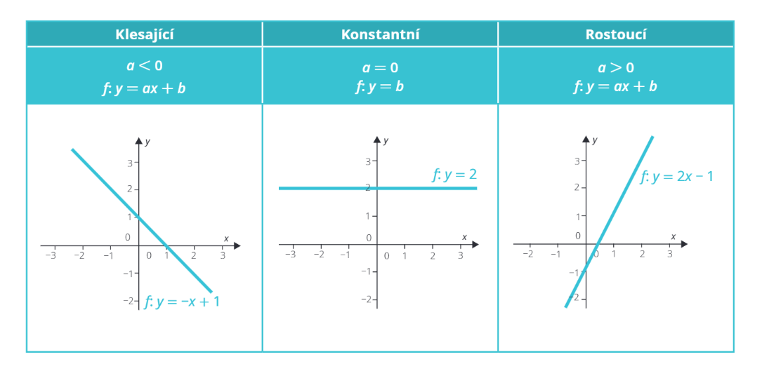 U lineární funkce se určuje, jestli je prostá, spojitá, konstantní, omezená, sudá, lichá, rostoucí nebo klesající.