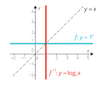 Logaritmická „funkce“ y=\log _{1} x je inverzní funkcí k funkci exponenciální y=1^{x}. Když tuto exponenciální funkci převedeš přes osu y=x a vytvoříš tak k ní inverzní funkci, zjistíš, že grafem bude svislá přímka procházející bodem [1; 0]. Z obrázku je jasné, že tato přímka nemůže být funkce. Definice funkce totiž říká, že jedno x může mít k sobě právě jedno y. A zde jedno x, konkrétně číslo 1 , má k sobě nekonečně mnoho bodů na ose y.