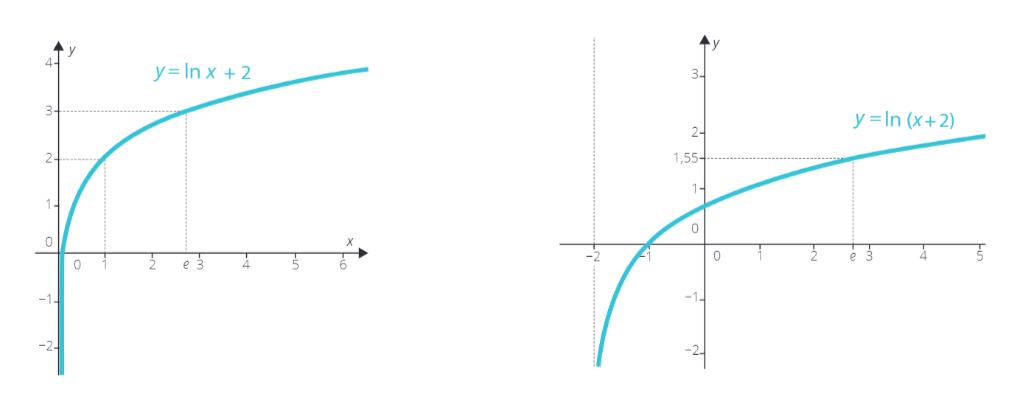 Číslo uvnitř argumentu logaritmu udává horizontální posunutí (ve směru osy x), např. In (x+2). Pokud je číslo za logaritmem, graf se posune vertikálně (ve směru osy y), např. In x+2. Na obrázcích výše vidíš, jak velký rozdíl udělá závorka. Jednou je v argumentu logaritmu celý výraz x+2, podruhé je v argumentu pouze samotné x.
