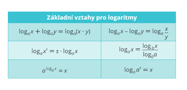 Následující vztahy platí pro logaritmy, které mají stejný základ. Vždy si dávej pozor, jestli to platí, až pak můžeš tyto vztahy použít.