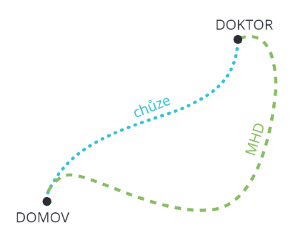 Jedním z matematických problémů je popsat cestu z bodu A do bodu B. Taková cesta může probíhat po velkém množství cest, ale vždy musí začít v bodě A a skončit v bodě B. Představ si, že jsi na počátku své cesty v pohodlí svého domova, ale musíš se dostat k doktorovi, protože je ti špatně. Bud' to využiješ cestu pěšky a půjdeš po tečkované čáře vyobrazené na obrázku níže, anebo pojedeš autobusem, která ale vede delší, čárkovanou trasou.
