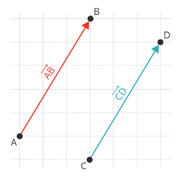 Stejný vektor může vycházet z různých bodů a vést do různých bodů, záleží pouze na posunu, který se vykoná. Na obrázku níže vidíš dva vektory, které jsou stejné nezávisle na tom, zda jdou z bodu A do B, nebo z bodu C do D.