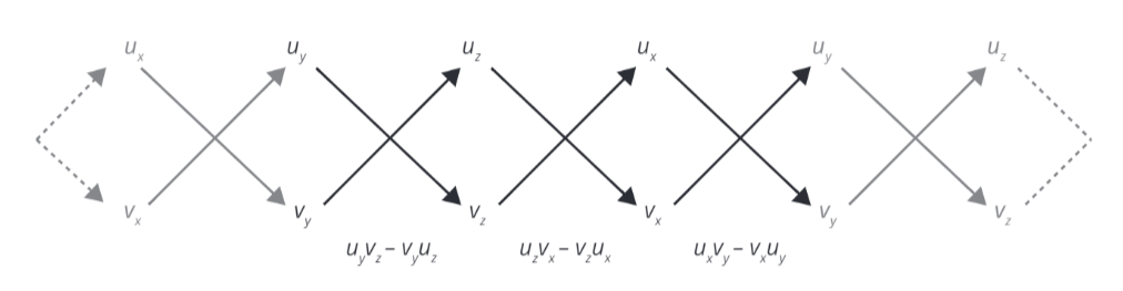 Vzorec se ti asi špatně pamatuje, proto ti prozradím trik. Když počítáš nějakou složku (souřadnici) vektorového součinu, provedeš výpočet pomocí druhých dvou souřadnic. Takže například jeho x-ovou složku získáš z y-ových a z-ových souřadnic násobených vektorů.