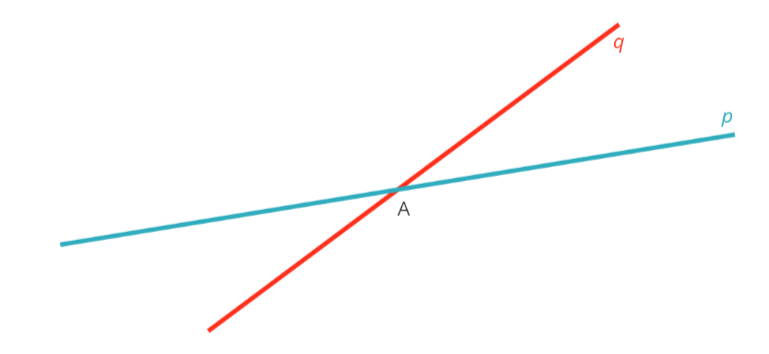 1)Přímky různoběžné mají různý směr, což znamená různé směrové vektory, které jsou lineárně nezávislé (jeden není násobkem druhého). Různoběžné přímky se vždy protnou v jednom bodě, jak ukazuje následující obrázek.