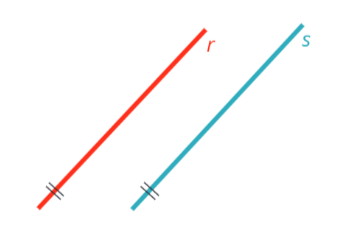2) Přímky rovnoběžné jsou přímky, které mají stejný směr. V analytické geometrii to znamená, že směrové vektory obou přímek jsou lineárně závislé. Tedy směrové vektory přímek můžeš zapsat tak, že jeden je násobek druhého. Obecně rovnoběžné přímky označené jako r a s vidíš na obrázku.