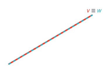 3) Rovnoběžné přímky se buď vůbec neprotínají, nebo se protínají v každém bodě. Pokud se neprotínají, jedná se o dvě rozdílné rovnoběžné přímky, pokud se protínají ve všech bodech (leží na sobě), říká se, že přímky jsou totožné. Na obrázku vidíš totožné přímky v a w, přičemž totožnost (neboli identita) se značí symbolem „三” (čti: „totožný”).
