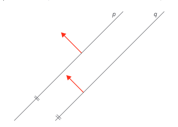 Pokud jsou přímky rovnoběžné a jejich směrové vektory jsou tedy lineárně závislé, musejí být lineárně závislé i normálové vektory obou přímek. Oba vzniknou rotací směrových vektorů o 90^{\circ}.