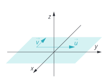Na obrázku vidíš dva vektory \vec{u} a \vec{v}, které leží ve zkoumané rovině. Jestliže jde každý bod na přímce napsat jako přičtení nějakého reálného násobku jednoho vektoru, půjde libovolný bod v ploše zapsat jako přičtení reálného násobku jednoho z vektorů a přičtení obecně jiného reálného násobku druhého vektoru. Z toho důvodu parametrické vyjádření roviny obsahuje ještě jeden parametr navíc, musí ale platit, že vektory jsou lineárně nezávislé.
