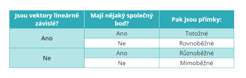 Pro lepší orientaci v určování vzájemné polohy přímek máš následující tabulku. Máš dvě přímky zadané parametricky: