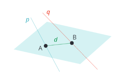 \left.\left.\begin{array}{r}p: x=a_{x}+t \cdot u_{x} \\y=a_{y}+t \cdot u_{y} \\z=a_{z}+t \cdot u_{z}\end{array}\right\} \begin{array}{lr}\mathrm{A}\left[a_{x} ; a_{y} ; a_{z}\right] \\\vec{u}=\left(u_{x} ; u_{y} ; u_{z}\right)\end{array} \quad \begin{array}{r}q: x=b_{x}+s \cdot v_{x} \\z=b_{y}+s \cdot v_{y} \\z \cdot v_{z}\end{array}\right\} \begin{array}{r}\mathrm{B}\left[b_{x} ; b_{y} ; b_{z}\right] \\\vec{v}=\left(v_{x} ; v_{y} ; v_{z}\right)\end{array}