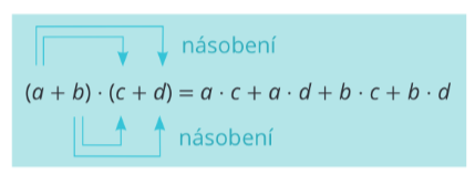 Při násobení mnohočlenu mnohočlenem budeš postupovat tak, že každý člen z jednoho mnohočlenu vynásobíš každým členem z druhého mnohočlenu. Názorněji to můžeš vidět na vzorečku níže.