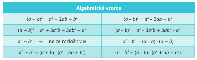 Existuje několik tzv. algebraických vzorců, které je důležité si pamatovat, protože se používají skoro v každém odvětví matematiky k tomu, aby šlo výrazy upravovat a zjednodušovat. Vzorečky se týkají především umocňování dvojčlenů a trojčlenů. V tabulce níže Ize nalézt základní vzorečky, které se nejčastěji používají.