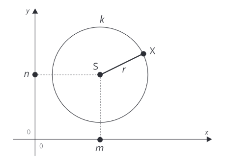 Z definice kružnice se dá odvodit středová rovnice kružnice. Nejprve určíš souřadnice středu kružnice, tj. \mathrm{S}[m ; n]. Neznámá m označuje bod na ose x a neznámá n označuje bod na ose y. Bod ležící na kružnici a jeho souřadnice se značí jako X[x;y]. Vzdálenost bodu S a libovolného bodu X je tedy r a s využitím zavedeného značení souřadnic tedy platí: