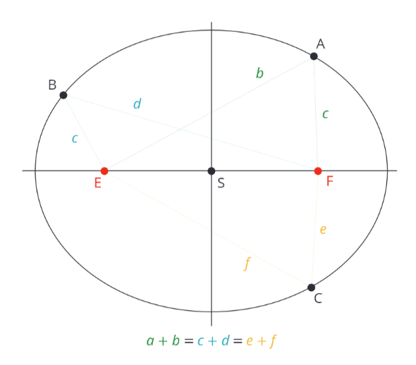 Každý bod na elipse má tu vlastnost, že když vyjdeš z jednoho ohniska do daného bodu na elipse a vrátíš se zpátky do druhého ohniska, tak celková ušlá vzdálenost bude vždy stejná, bez ohledu na to, který bod z elipsy to je, např. body A, B a C na obrázku níže.
