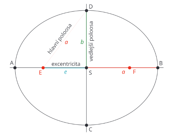 Na obrázku elipsy máš vyznačené poloosy (tj. a a b) a polovinu ohniskové vzdálenosti (tj. e). S použitím Pythagorovy věty se dá přijít na vztah: