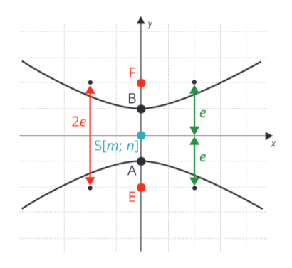 Středový tvar hyperboly h orientovaný podle osy \boldsymbol{y} poznáš tak, že osa souměrnosti procházející středem hyperboly a ohnisky je rovnoběžná s osou y. Jednoduše řečeno, je otočená o 90^{\circ} oproti hyperbole orientované podle osy x. Vypadá například takto: