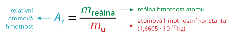 Jak již bylo zmíněno dříve, atomová hmotnostní konstanta se používá k výpočtu relativní atomové hmotnosti. Relativní atomovou hmotnost získáš, když reálnou hmotnost atomu podělíš atomovou hmotnostní konstantou.