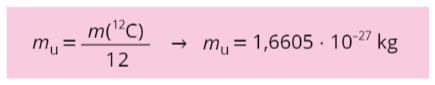 Atomová hmotnostní konstanta m_{\mathrm{u}} má hodnotu rovnu jedné dvanáctině skutečné hmotnosti nuklidu uhlíku { }^{12} \mathrm{C}.