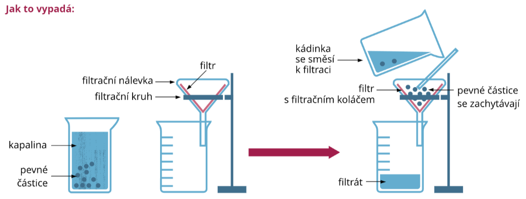 Jak se provádí: Směs pevné látky s kapalinou se nalije za pomoci tyčinky na filtr nebo síto. Kapalná látka filtrem proteče (říká se jí pak filtrát), zatímco pevná látka se zachytí na filtru (a vznikne tzv. filtrační koláč). V laboratoři se jako filtr používá bud' filtrační papír, nebo frita (skleněný nebo porcelánový filtr). Celý proces můžeš urychlit tím, že budeš v prostoru pod filtrem snižovat tlak, tím pádem roztok přes filtr proteče rychleji.