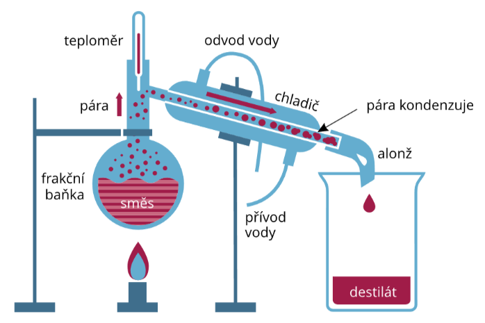 Jak se provádí: Směs kapalných látek zahřeješ na teplotu, při níž vře látka s nižší teplotou varu, kterou chceš ze směsi odstranit (nebo naopak získat). Ta se začne z roztoku vypařovat a ve formě páry stoupat do chladiče. Tam kondenzuje, stává se z ní opět kapalina a odtéká do sběrné baňky. Látce odstraněné, respektive získané, ze směsi se říká destilát.