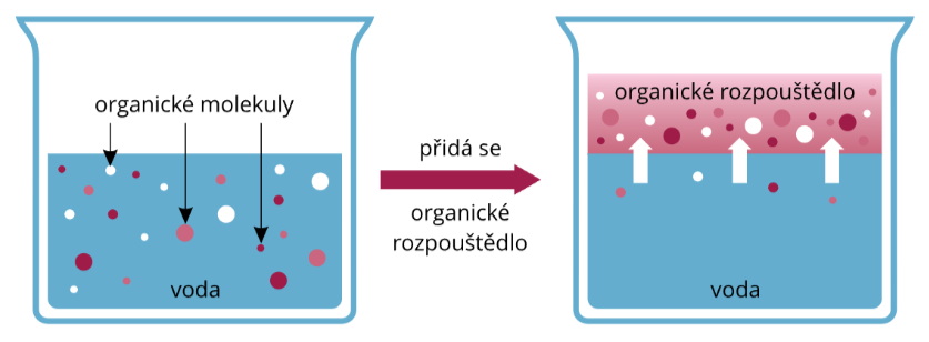 Jak se provádí: Extrakci můžeš použít v případě, kdy máš v jednom roztoku látku, která se různě rozpouští v různých rozpouštědlech. Například kofein se sice rozpouští ve vodě, ale mnohem lépe se rozpouští v organických rozpouštědlech (třeba dichlormethanu). Pokud tedy ke kávě (roztoku kofeinu) přiliješ dichlormethan, který se s vodou nemísí, vytvoří rozpouštědla dvě vrstvy. Kofein pak „uteče“ z vody do dichlormethanu. Poté stačí nežádoucí rozpouštědlo vypustit nebo odsát. V každém případě tak získáš kávu bez kofeinu (bylo by ale dobré podotknout, že takhle se káva bez kofeinu nevyrábí).