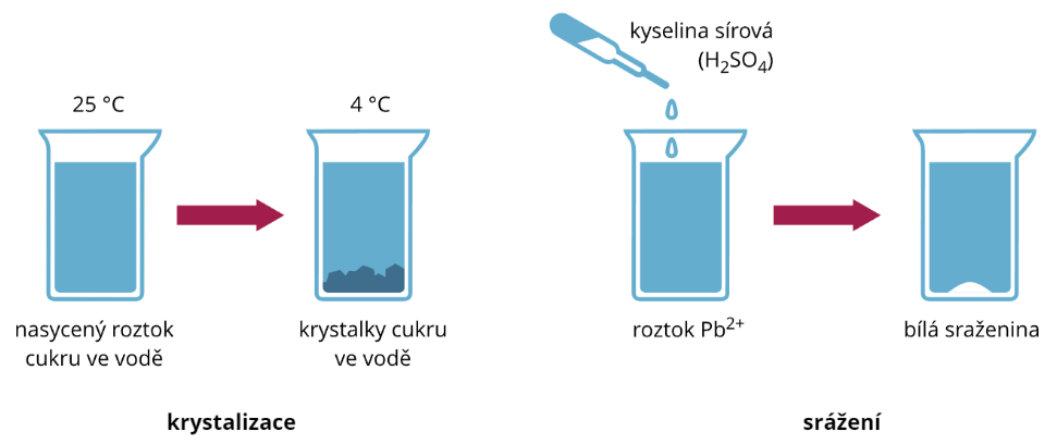 Druhou možností je srážení pomocí srážecího činidla. Například kation olovnatý \left(\mathrm{Pb}^{2+}\right) není v roztoku nijak vidět. Pokud ale do roztoku přidáš trochu kyseliny sírové \left(\mathrm{H}_{2} \mathrm{SO}_{4}\right), vznikne chemickou reakcí nerozpustná bílá sraženina síranu olovnatého \left(\mathrm{PbSO}_{4}\right). Tu můžeš například odfiltrovat. Srážecí reakce se dříve v analytické chemii často využívaly k důkazu toho, že se v roztoku nachází určitá látka.