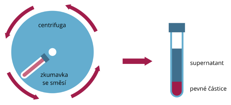Jak se provádí: Pokud jsou ve směsi rozptýlené částice pevné látky, jednoduchý způsob, jak je odstranit, je, že počkáš, až se usadí na dně. Čirou tekutinu bez pevných částic prostě vyliješ. Tomuto se správně říká dekantace. Protože to ale může být pomalý proces, používá se někdy k jeho urychlení centrifuga. Ve zkumavce se směsí se působením odstředivé síly vytvoří vrstva pevné látky na dně a vrstva roztoku nad ní (tzv. supernatant).