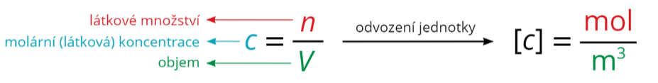 Základní jednotkou dle \mathrm{SI} je \mathrm{mol} \cdot \mathrm{m}^{-3}\left(\frac{\mathrm{mol}}{\mathrm{m}^{3}}\right), ale používanější je právě mol\cdot\mathrm{dm}^{-3}\left(\frac{\mathrm{mol}^{3}}{\mathrm{dm}^{3}};1\mathrm{dm}^3=1\right. litr ). Někdy se můžeš setkat se zápisem, kdy se 1 \mathrm{~mol} \cdot \mathrm{dm}^{-3} píše jako 1\:\mathrm{M}. Tento způsob zápisu se používá spíše ve psané formě nebo u označování molarity v laboratořích, kde takto šetříš prostor na lahvích a svůj čas. Je to ovšem stará forma, která by se již neměla používat.