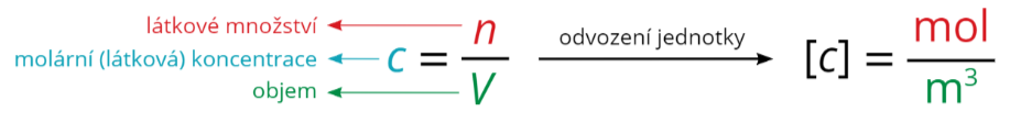 Jednotkou je \mathrm{mol} \cdot \mathrm{dm}^{-3} a lze ji zapsat jako \mathrm{M}\left(1\mathrm{~mol}\cdot\mathrm{dm}^{-3}=1\:\mathrm{M}\right).