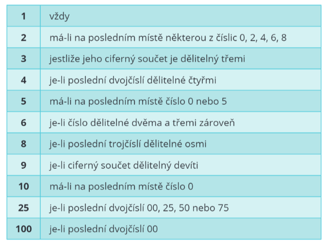 Existuje několik pravidel (tzv. dělitelnost přirozených čísel), která ti pomohou určit, zda je nějaké číslo dělitelné například číslem 2. V tabulce níže jsou shrnuty pomůcky, jak dělitelnost určit u přirozených čísel, se kterými se potkáš nejčastěji. Ještě je důležité zmínit, že když se řekne, že například číslo 20 je dělitelné čtyřma, tak se myslí, že je dělitelné beze zbytku (tím pádem se spojení „beze zbytku“ vynechává a říká se jen „je dělitelné“).