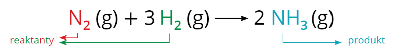Reaguje v ní plynný dusík \left(\mathrm{N}_{2}\right) s plynným vodíkem \left(\mathrm{H}_{2}\right), při čemž vzniká plynný amoniak \left(\mathrm{NH}_{3}\right). Jak vyjádřit rychlost této reakce? Například tak, že uvedeš, jak rychle přibývá (tvoří se) produkt. Druhou možností je sledovat, jak rychle ubývá (přeměňuje se) některý z reaktantů. Protože v rovnici vidíš dva reaktanty a jeden produkt, máš celkem tři jednoduché možnosti, jak rychlost reakce vyjádřit. Může to být bud' množství amoniaku, které vznikne za určitý čas (např. 0,32 \mathrm{mol} \cdot \mathrm{l}^{-1} \cdot \mathrm{s}^{-1} ), množství dusíku, které ubude za určitý čas, nebo množství vodíku, které ubude za určitý čas. Vyjádřeno matematicky by to vypadalo takto: