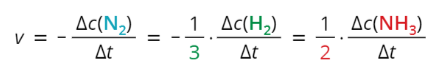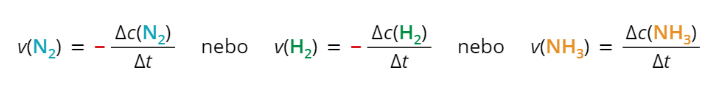 Problém je, že když si rychlost reakce napíšeš takto, bude rychlost reakce pro každý reaktant a produkt jiná. Na každou molekulu dusíku, která se spotřebuje, se totiž musejí spotřebovat tři molekuly vodíku a vzniknou dvě molekuly amoniaku.