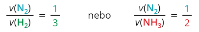 Stechiometrické koeficienty v rovnici ti říkají, že vodík bude ubývat třikrát rychleji než dusík a že amoniak bude přibývat dvakrát rychleji, než bude ubývat dusík.