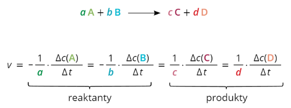 Rychlost celé reakce je ale možné zapsat jedinou rovnicí. Pokud znáš změny množství pouze jednoho reaktantu nebo produktu, snadno z ní díky stechiometrickým koeficientům dopočítáš změnu množství jakékoliv jiné látky, která se reakce účastní.