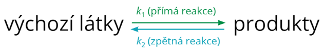 Když reakci necháš samovolně probíhat a nebudeš do ní zasahovat, stane se to, že se vodík a jód přemění na jodovodík, ale část jodovodíku se rozloží zpět na vodík a jód. Z minulé podkapitoly víš, že se rychlost chemické reakce odvíjí jednak od teploty (rychlostní konstanty) a jednak od koncentrace látek. Takže jak se koncentrace reaktantů bude snižovat, bude se přímá reakce zpomalovat. Naopak produktu bude přibývat, takže se bude postupně zrychlovat zpětná reakce. Po nějaké době se rychlosti obou reakcí vyrovnají, čímž dojdou do rovnováhy. Výsledkem bude směs reaktantů a produktů, které budou v určitém poměru.