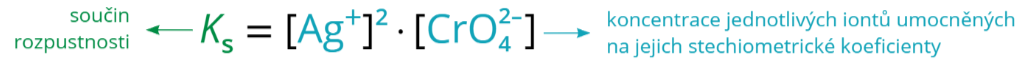 Na levé straně rovnice je nerozpuštěný chroman stříbrný, na pravé straně ionty, které vznikly rozpuštěním velmi malé části sraženiny. Pomocí Guldbergova-Waagova zákona zapíšeš rovnovážnou konstantu pro tuto reakci (viz podkapitola 6.1. Chemické rovnováhy). V čitateli zlomku budou produkty reakce (rozpuštěné ionty) a ve jmenovateli reaktanty (sraženina).