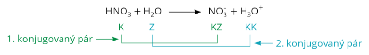 U těchto reakcí se vždy jedna látka chová jako kyselina a druhá jako zásada. Je to tedy reakce mezi dvěma látkami. Kyselina dusičná, jak již název napovídá, se bude chovat jako kyselina (K). Odštěpí svůj proton a stane se z ní konjugovaná zásada (KZ). Voda se naopak musí chovat jako zásada (Z) při reakci s kyselinou. Odštěpený proton přijme a vznikne tzv. oxoniový kation \mathrm{H}_{3} \mathrm{O}^{+}. Ten má navíc proton, takže se chová jako konjugovaná kyselina (KK).