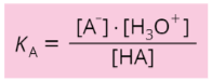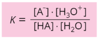 Většinou však pracujeme s vodnými roztoky, kde je voda oproti kyselině ve velkém nadbytku a její koncentrace se prakticky nemění. Můžeme tedy celou rovnici vynásobit \left[\mathrm{H}_{2} \mathrm{O}\right] a tím ji zahrnout do konstanty, čímž dostaneme novou konstantu - disociační konstantu kyseliny K_{\mathrm{A}}.