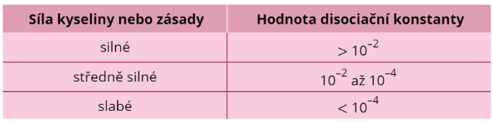 Obecně platí pro kyseliny i zásady to, že čím vyšší je disociační konstanta, tím silnější je konkrétní látka. Hodnoty disociačních konstant obvykle najdeš v tabulkách a mimo jiné se běžně používají k rozdělení kyselin a zásad na slabé, středně silné a silné.